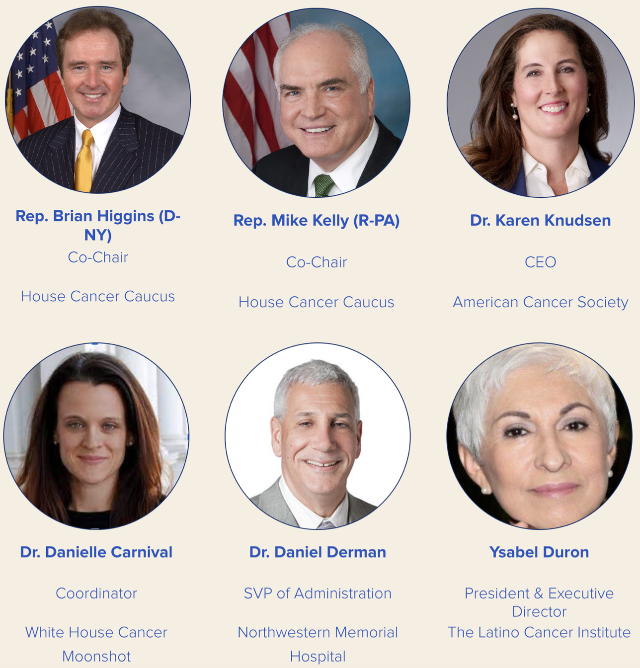 Rep. Brian Higgins (D-N.Y.), Co-Chair, Cancer Caucus; Member, House Ways & Means Committee Rep. Mike Kelly (R-Pa.), Co-Chair, Cancer Caucus; Senior Member, House Ways & Means Committee Ysabel Duron, President & Executive Director, The Latino Cancer Institute Dr. Daniel Derman, SVP of Administration, Northwestern Memorial Hospital