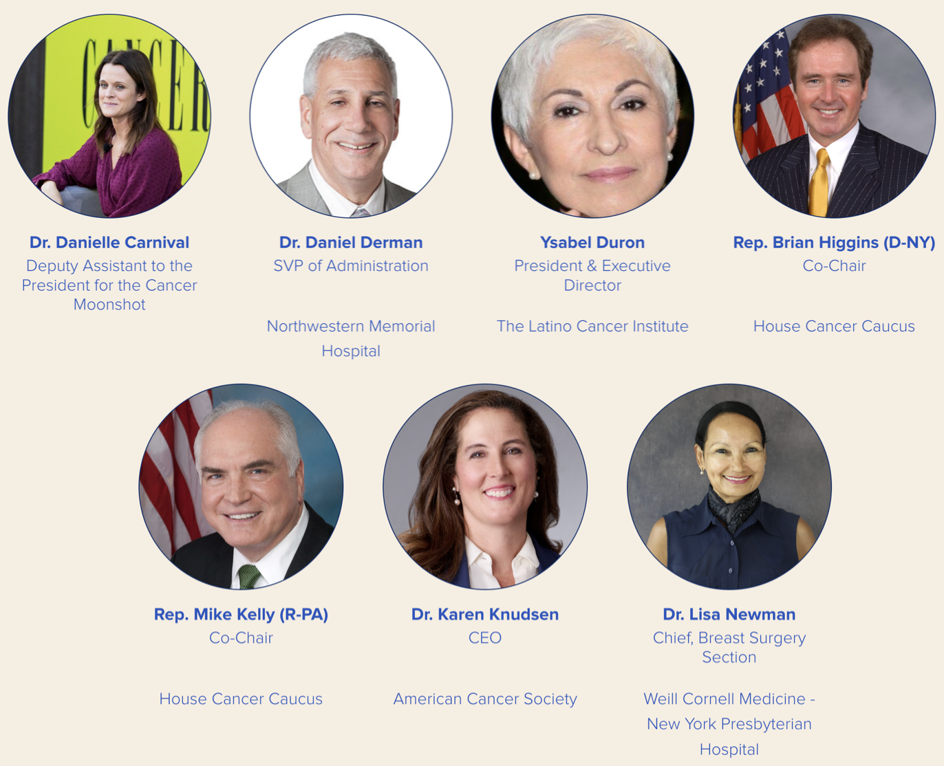 Rep. Brian Higgins (D-N.Y.), Co-Chair, Cancer Caucus; Member, House Ways & Means Committee Rep. Mike Kelly (R-Pa.), Co-Chair, Cancer Caucus; Senior Member, House Ways & Means Committee Ysabel Duron, President & Executive Director, The Latino Cancer Institute Dr. Daniel Derman, SVP of Administration, Northwestern Memorial Hospital Dr. Lisa Newman, Chief, Breast Surgery Section, Weill Cornell Medicine – New York Presbyterian Hospital
