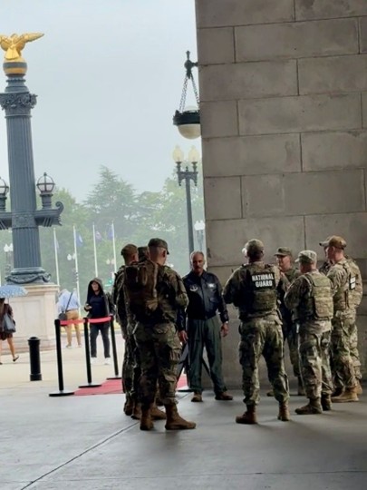 But what about my morning coffee run with the National Guard?: | ^I snapped this photo of National Guard troops gathering around Union Station this morning. Even after a month of their deployment, it is still striking to see them hanging out around the city. |